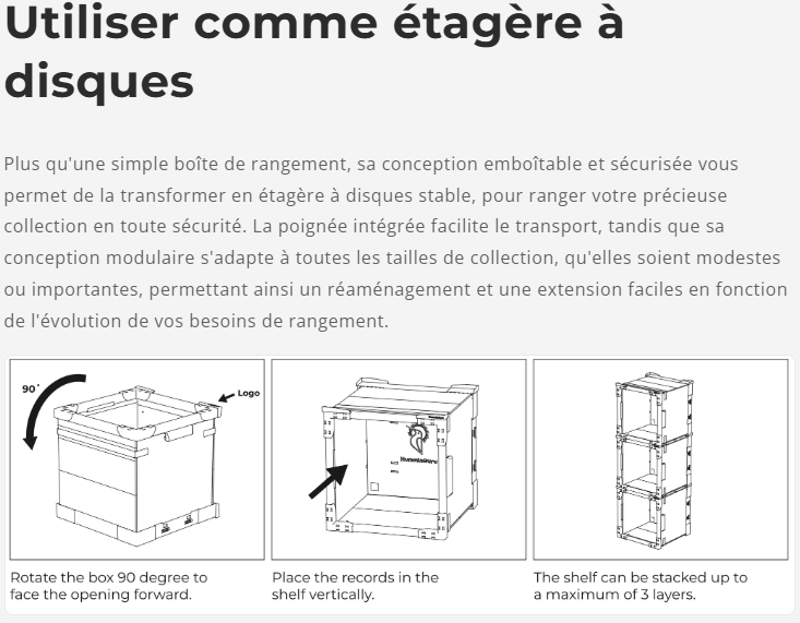 Conçu pour les disques 12 pouces (33 tours), chaque cube peut contenir jusqu’à 70 vinyles. Sa conception intelligente permet de superposer jusqu’à 3 cubes pour un gain de place optimal, et de le replier à plat lorsqu’il n’est pas utilisé.
