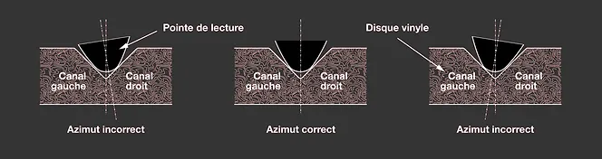 L’azimut de la cellule phono est un paramètre clé pour obtenir la meilleure image stéréo et la meilleure mise en scène sonore. Pour obtenir les meilleures performances, l’azimut de votre cellule phono doit être calibré. Les stylets Line Contact et Micro Line d’aujourd’hui ont une très petite surface de contact de rainure par rapport aux stylets elliptiques, ce qui nécessite un réglage plus fin. L’alignement azimutal correct assure la séparation la plus élevée des canaux et le meilleur équilibre des canaux, offrant un son et une image exceptionnels à partir de votre collection de disques stéréo.