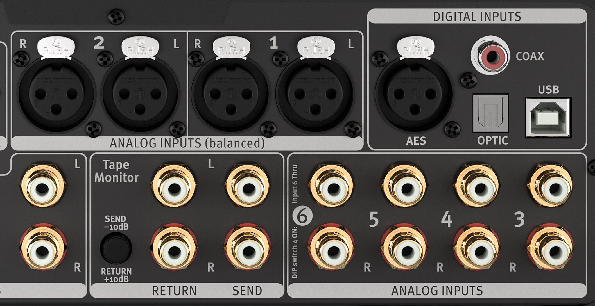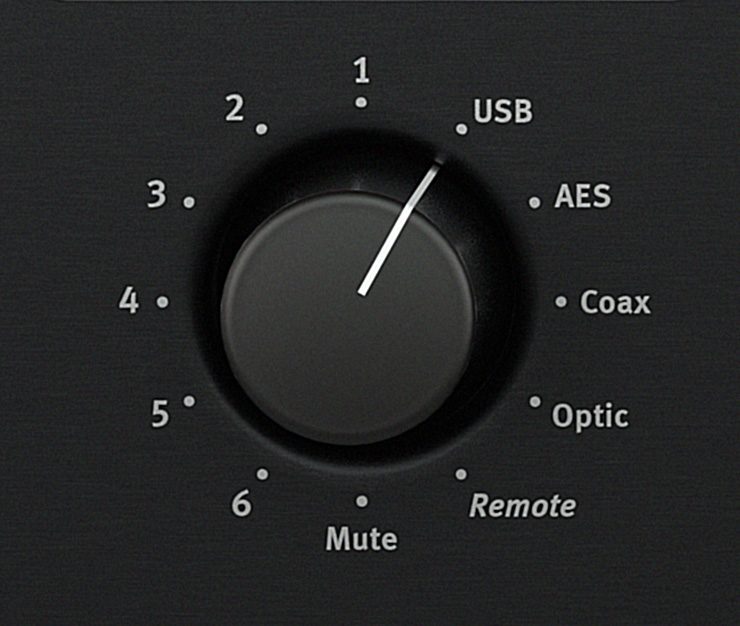 Jusqu'à dix (10 !) sources stéréo peuvent être connectées au Director Mk2. Six d'entre elles sont destinées aux signaux d'entrée analogiques, et quatre aux signaux d'entrée numériques. La sélection de la source est affichée sur l'écran LED matriciel : IN 1 à IN 6 pour les entrées analogiques, AES, USB, COAX, OPTIC pour les entrées numériques, avec la fréquence d'échantillonnage détectée affichée après environ deux secondes. Par exemple, U768 = entrée USB avec une fréquence d'échantillonnage de 768 kHz. La sélection de la source peut également être effectuée à distance si le commutateur rotatif est réglé sur la position "Remote".